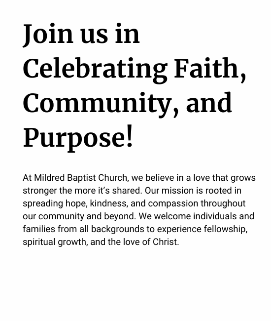 Here, questions are encouraged, and genuine connections are celebrated. We strive to walk alongside each other in life’s journey, offering support and kindness at every step. At Mildred Baptist Church, we follow Christ’s example of love, empathy, and acceptance, inviting you to experience a place where true community means leaving judgment at the door. Come as you are, and let us grow in faith together.