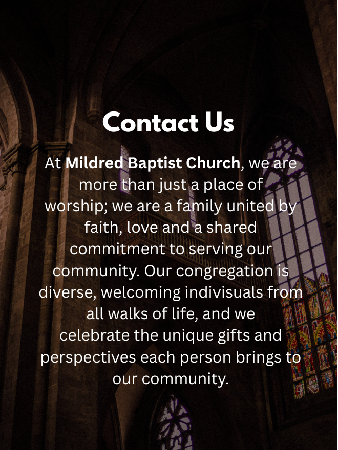 We invite you to join our journey of faith and service. Whether you’re looking for a place to worship, seeking spiritual guidance, or wanting to connect with others, you’ll find a home at Mildred Baptist Church. Come and discover how we can grow together with love and faith.